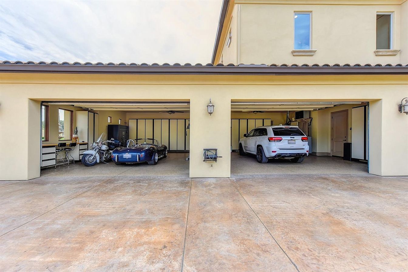 Room with desk, cabinets, and glass doors opening to a backyard pool area.